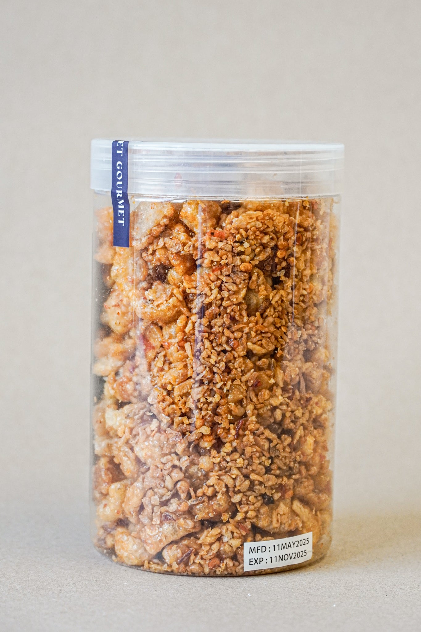 Our Crispy Pork Fat with Garlic Fish Sauce is a savory and indulgent treat that combines crispy, golden pork fat with the rich, aromatic flavors of garlic and fish sauce. The pork fat is fried to perfection, creating a crunchy texture that pairs beautifully with the bold, umami-packed garlic fish sauce, offering a perfect balance of savory, salty, and slightly sweet flavors.
