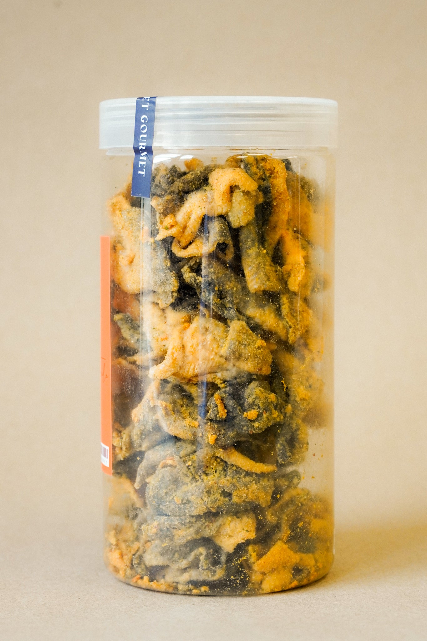 Each piece is made from premium fish skin, deep-fried to golden perfection and generously seasoned with a blend of salted egg yolk. Whether you're enjoying it on its own, sharing with friends, or using it as a crunchy topping for rice or noodles, this snack delivers a burst of flavor in every bite.