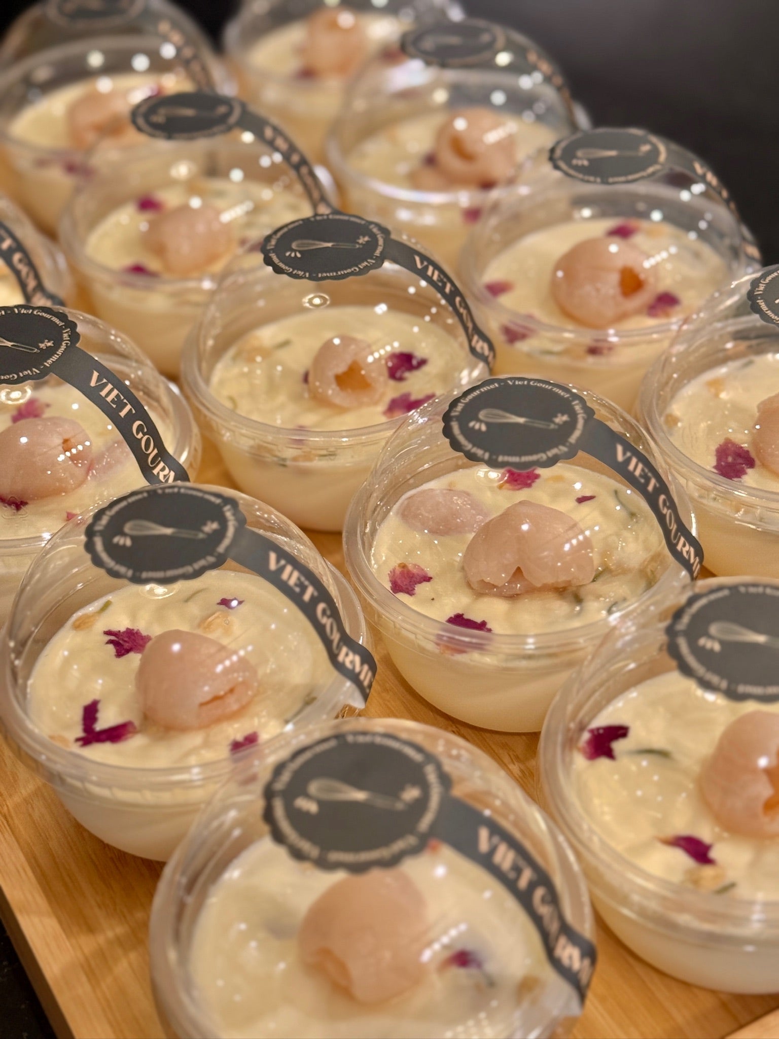 This panna cotta features a velvety smooth cream base infused with natural lychee and a hint of jasmine blossom aroma. The result is a light, floral, and fruity dessert that melts in your mouth and lingers gently on the palate.