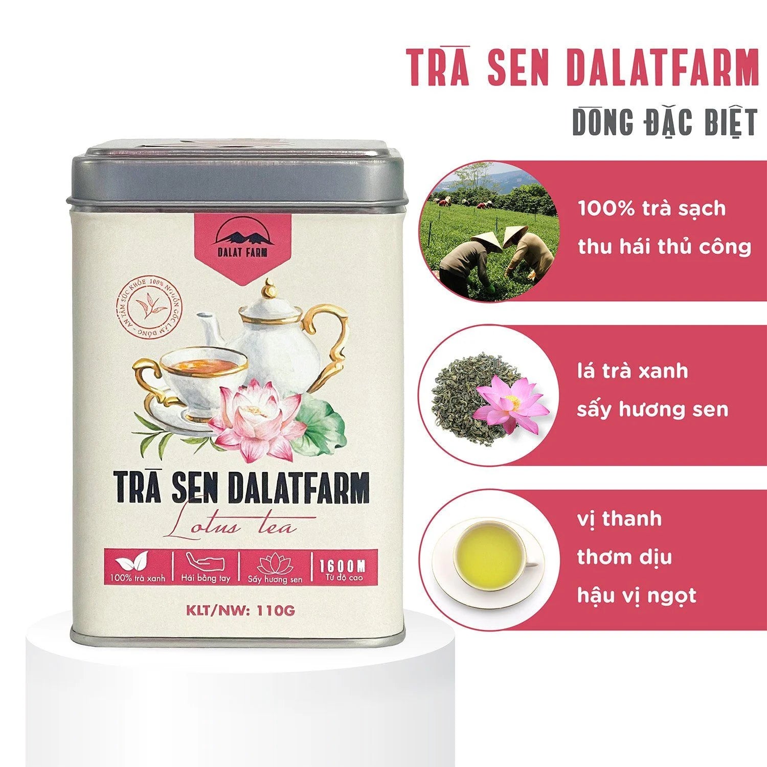 Mô tả sản phẩm: Trà Sen DaLat Farm là sự kết hợp tinh tế giữa 100% lá trà xanh tuyển chọn từ cao nguyên và hoa sen tự nhiên được sấy hương theo phương pháp truyền thống.