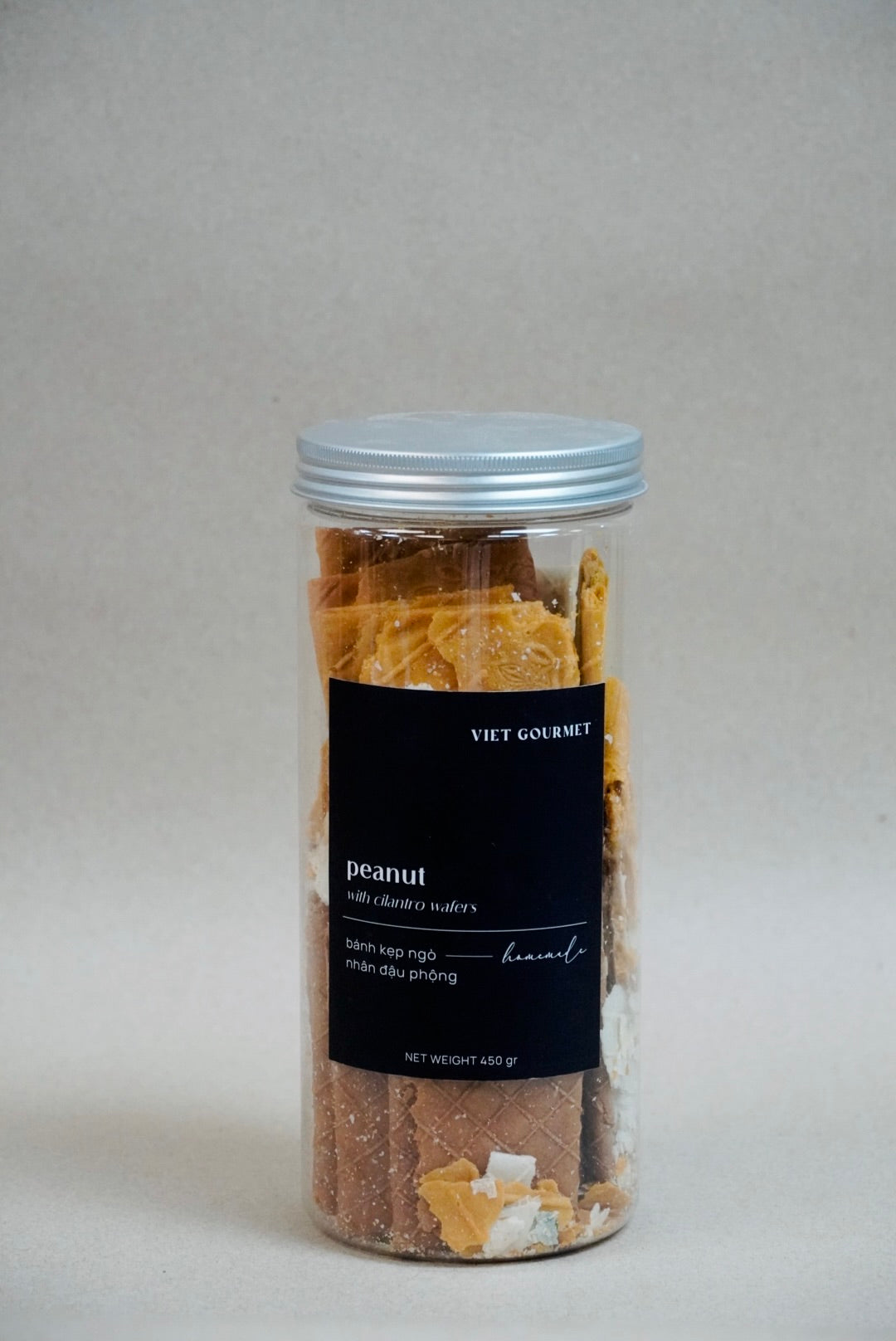 Bánh Kẹp Ngò Đậu Phộng is a crispy, fragrant Vietnamese wafer made with a unique blend of roasted peanuts and fresh cilantro, creating a perfect balance of nutty richness and herbal freshness. Each bite delivers a light, crunchy texture with a subtle sweetness and a delightful aroma.
